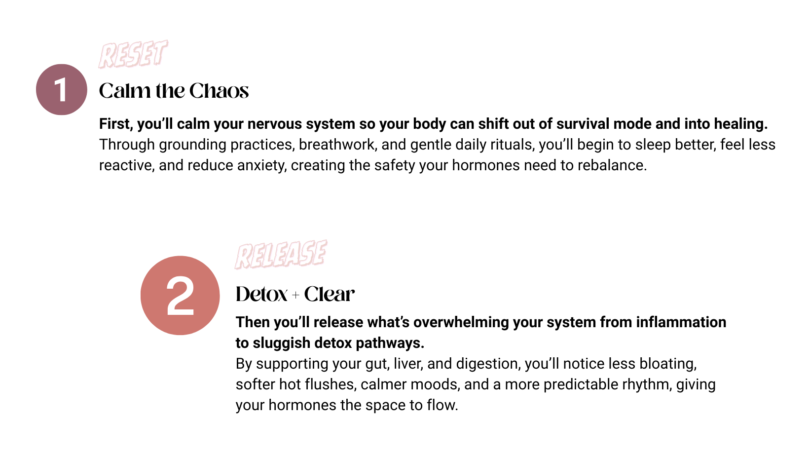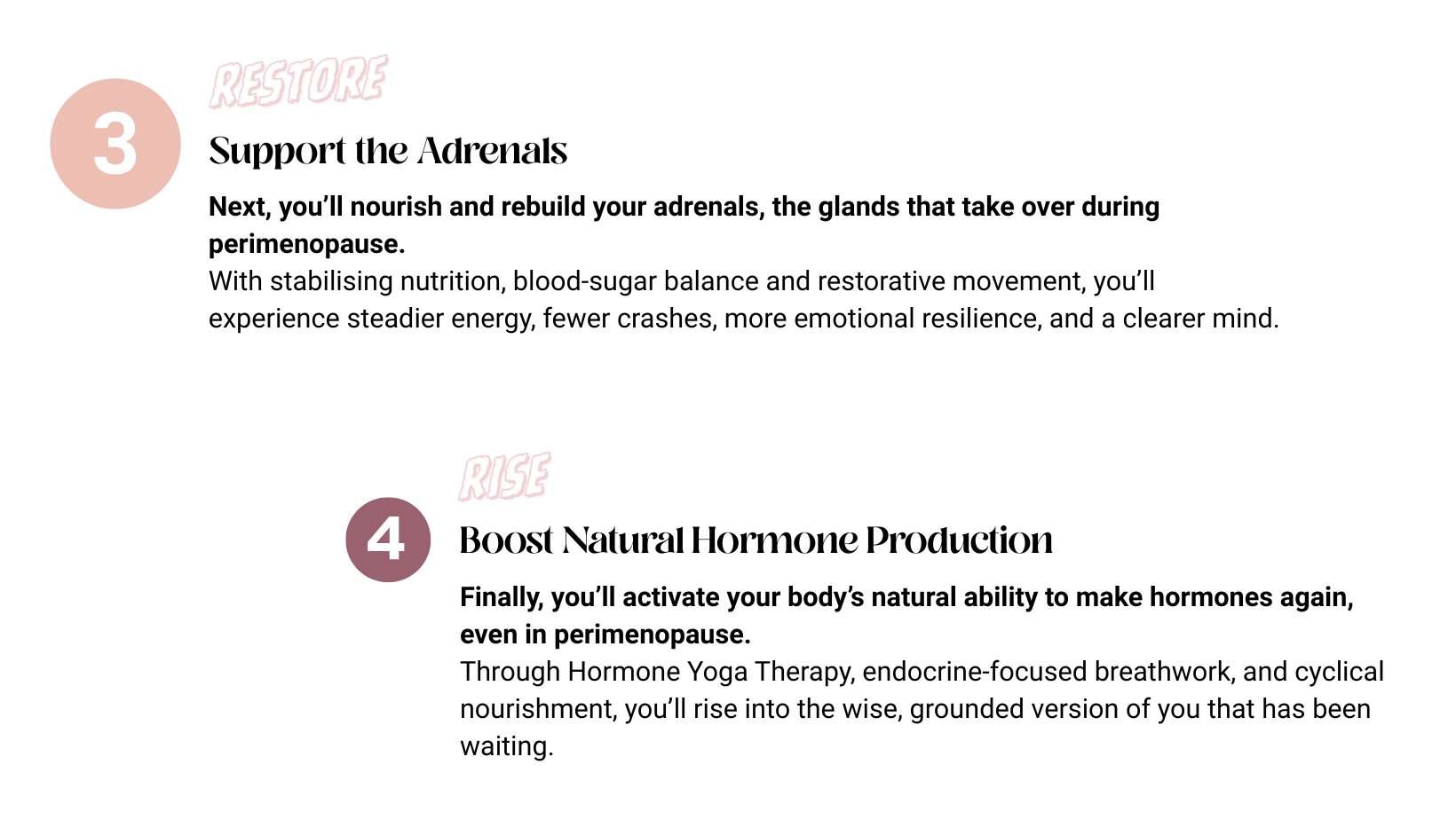 A 4-pillar holistic pathway designed to calm your stress system, clear what’s blocking balance, restore your energy, and naturally boost hormone production during perimenopause.